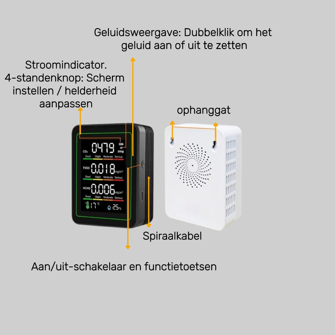 De kleurindicator (groen → geel → oranje → rood) laat direct zien hoe gezond de lucht is, gebaseerd op officiële normen.